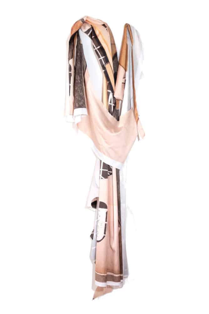 Ibrahim Azab makes framed digital collages which hang alongside a painted wall text in the exhibition, the paint marks weave between the printed collage and the spray-painted wall. Further breaking the boundaries of the conventional photograph, a digitally printed fabric hangs from the architecture of the space.