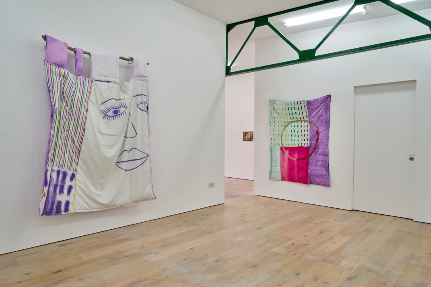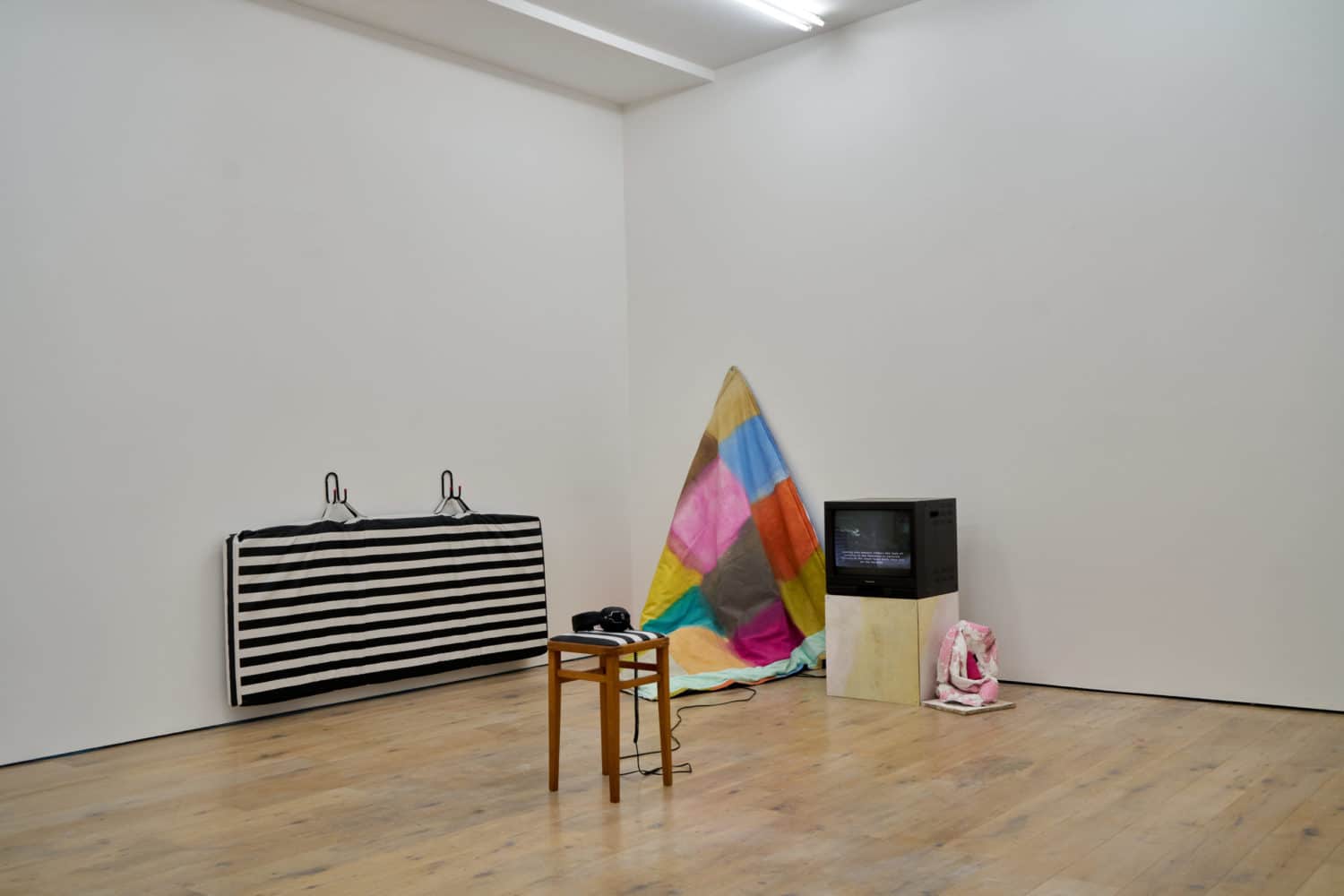 Gould works in a similar manner. She does not prioritise one medium over another; video, fabric and words intertwine.The quilt works are often recycled from previous installations or from her environment meaning they are never finished, always moving from one state into the next. Included in the work titled ‘Doughy Folds, Soft Like Marshmallow’ are parts of pink felt sun-bleached from when it lined the curtains of the couple’s caravan during a freezing winter. Like the cyclical ideas explored in the exhibition title, the works themselves aim to preserve objects and time. Even when applied to video work the significance of everyday life is at the fore; Gould’s readings are layered with sounds of the artist’s children and techno music from the studio.