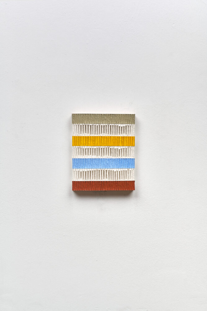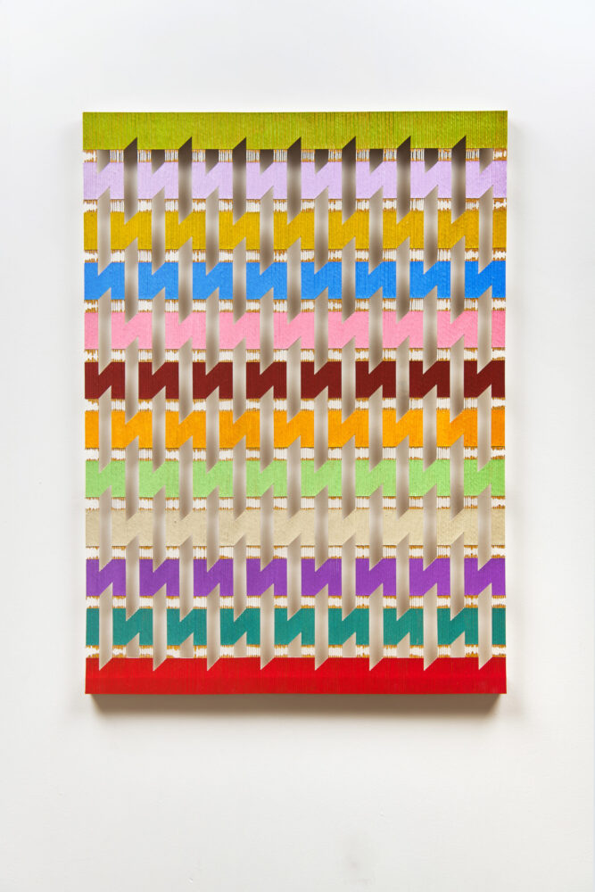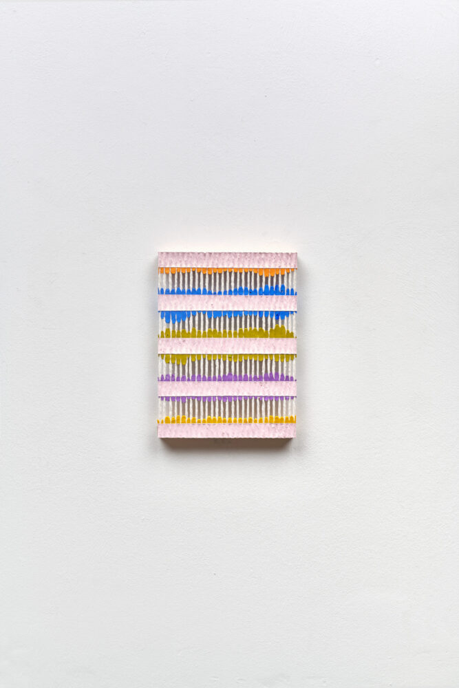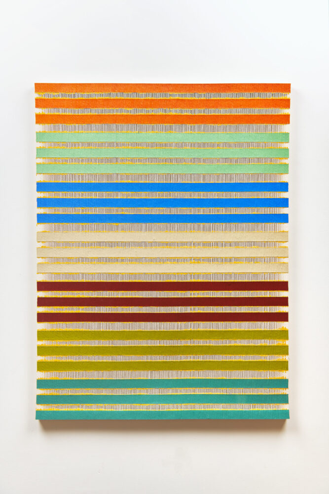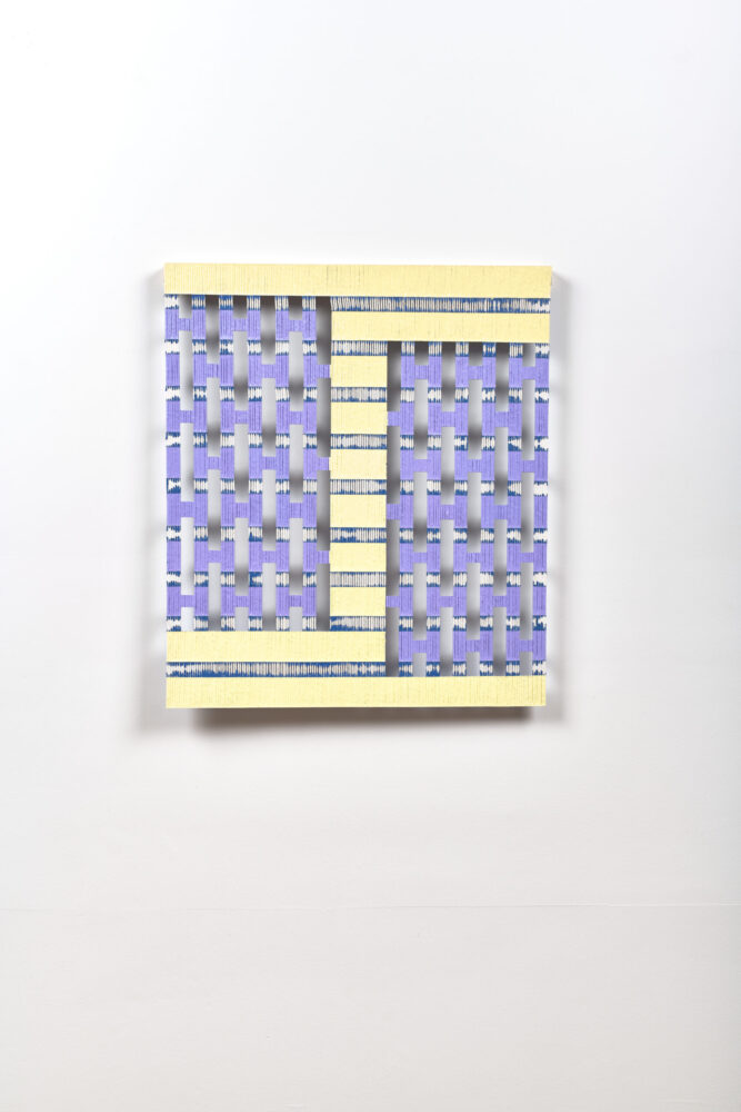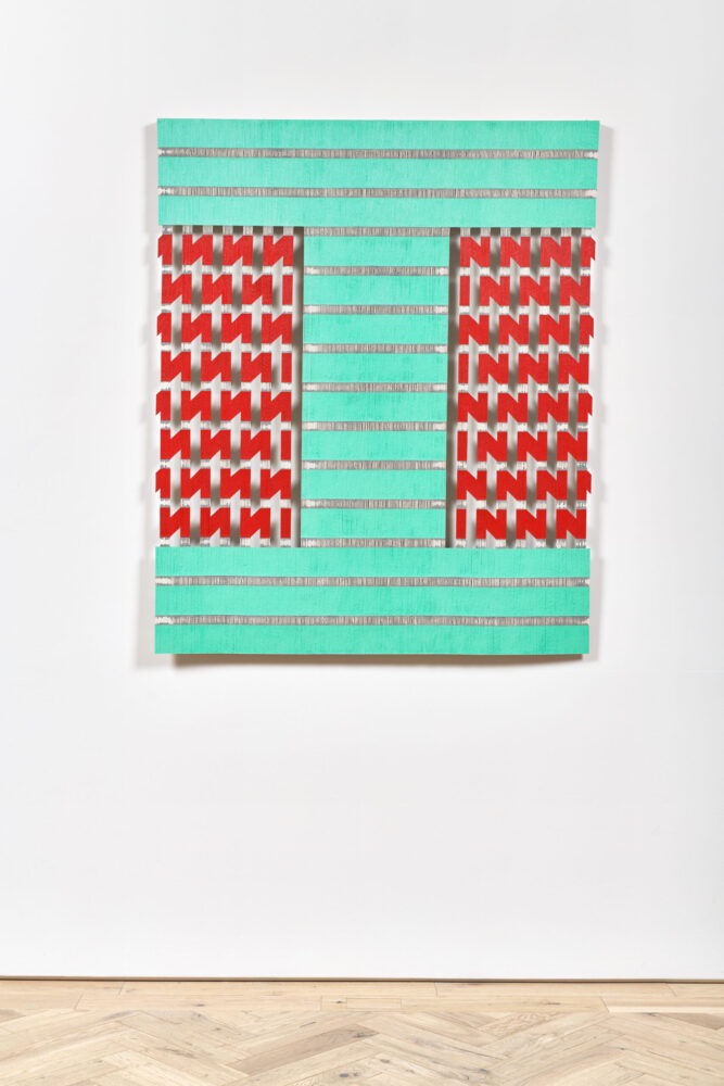 Logan’s innovative approach to painting is a distinctive process involving the flooding, sealing and warping of lengths of string using the gradual application of layers of paint. The string support allows for colour to be suspended within, resulting in works with an open, fretted structure and an innate delicacy. The porous nature of the paintings carve out an almost sculptural relationship between space and surface. This interplay provides the works with a frequency, a rhythm emerging from within the tender balance between paint and structure.